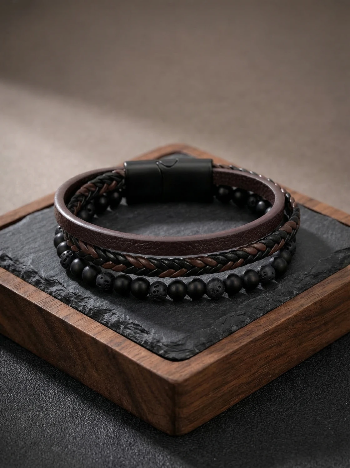Bransoletka męska z kamieni naturalnych w połączeniu z plecioną skórą w odcieniach czerni i brązu tworzy stylowy, wielowarstwowy dodatek. Surowa lawa wulkaniczna nadaje całości charakteru, a zestawienie różnych faktur podkreśla nowoczesny, męski design. Solidne zapięcie magnetyczne zapewnia wygodę użytkowania, a uniwersalna kolorystyka sprawia, że bransoletka doskonale pasuje do codziennych i bardziej eleganckich stylizacji. To wyrazisty akcent dla mężczyzn ceniących naturalne materiały i ponadczasowy styl.