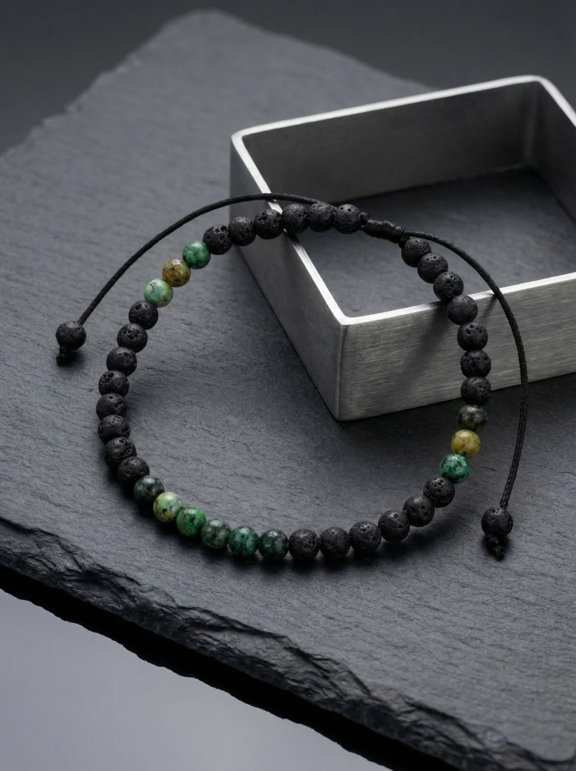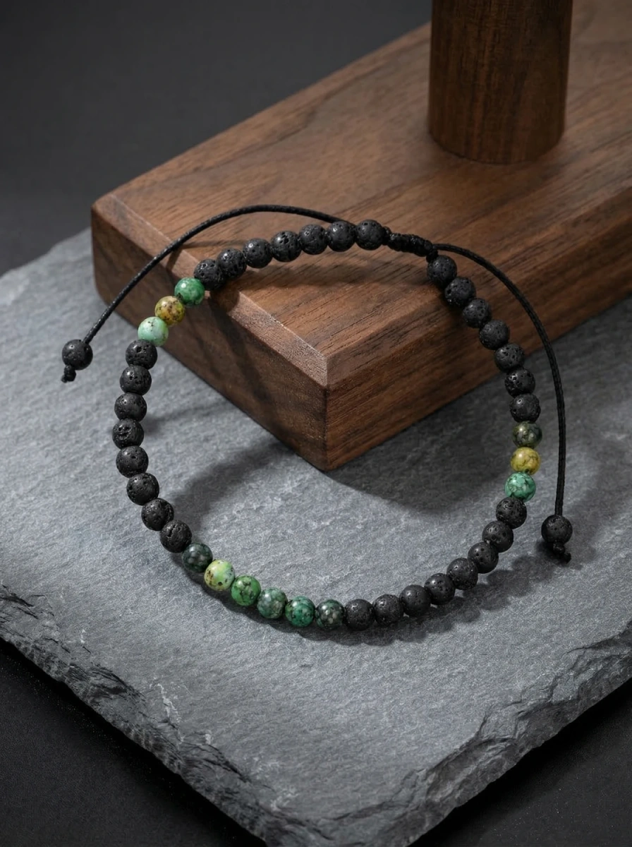 Bransoletka męska z kamieni naturalnych łącząca surową lawę wulkaniczną z charakterystycznym turkusem afrykańskim tworzy wyrazisty, nowoczesny dodatek dla mężczyzn ceniących styl i autentyczność.