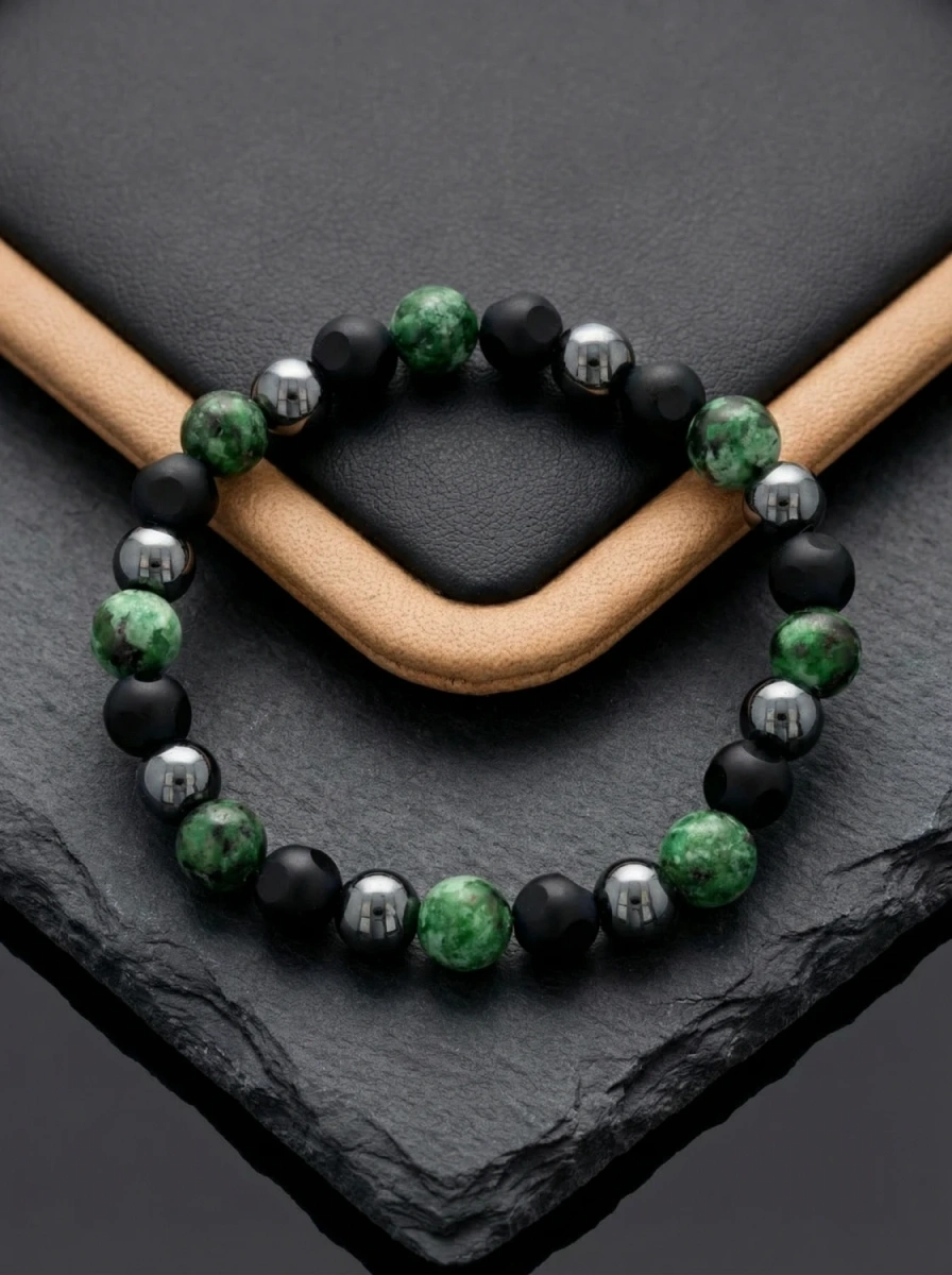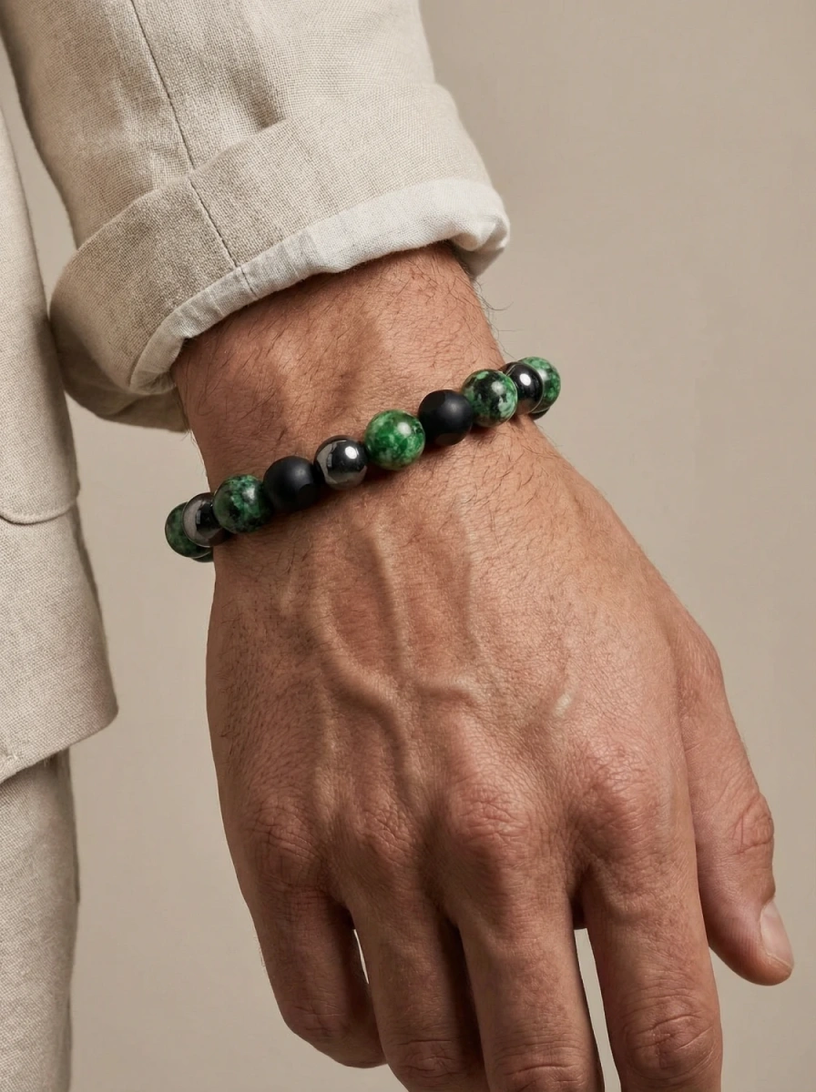 Kontrast między matową czernią, metalicznym akcentem i zielonymi kamieniami nadaje biżuterii wyrazisty, męski charakter.