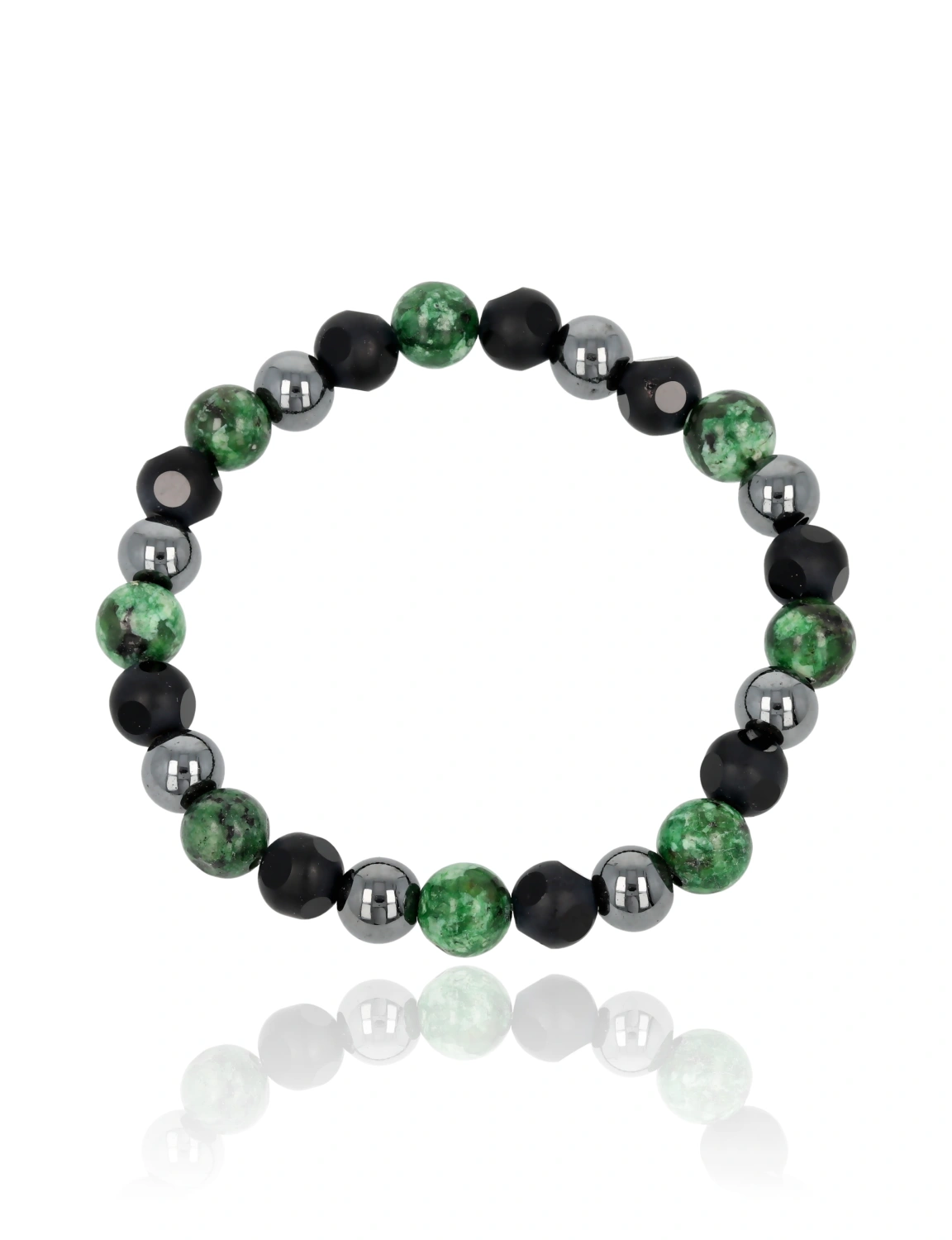 Bransoletka męska z kamieni naturalnych łączy głęboki czarny onyks, charakterystyczny turkus afrykański oraz połyskujący hematyt, tworząc elegancką i nowoczesną kompozycję.
