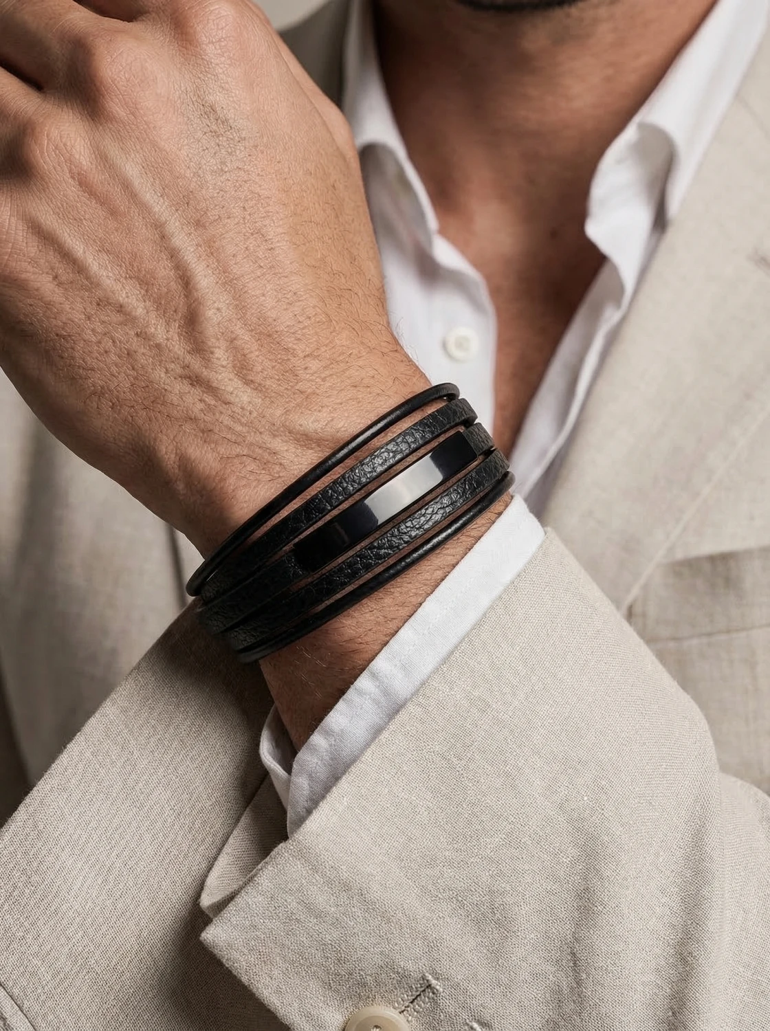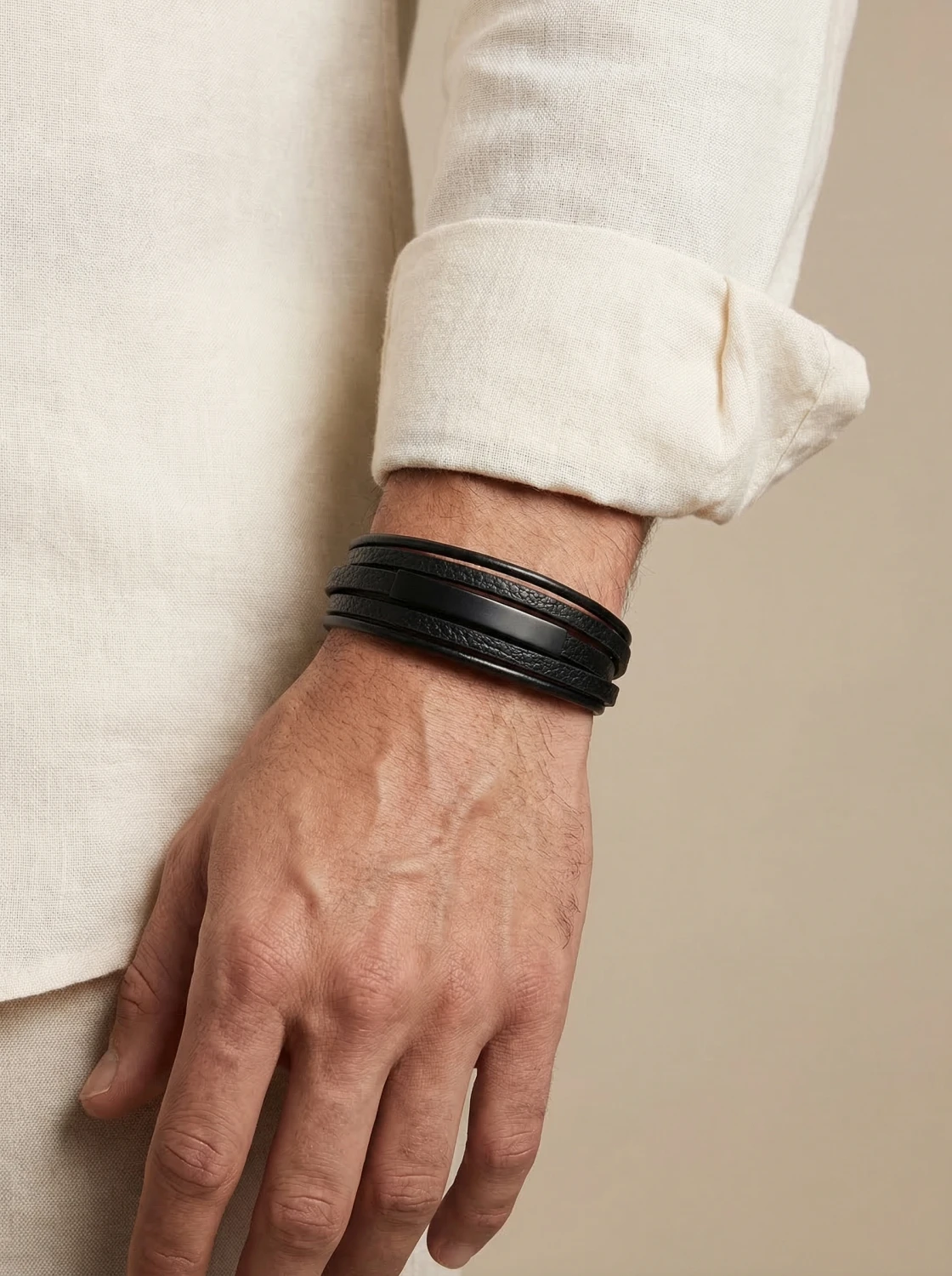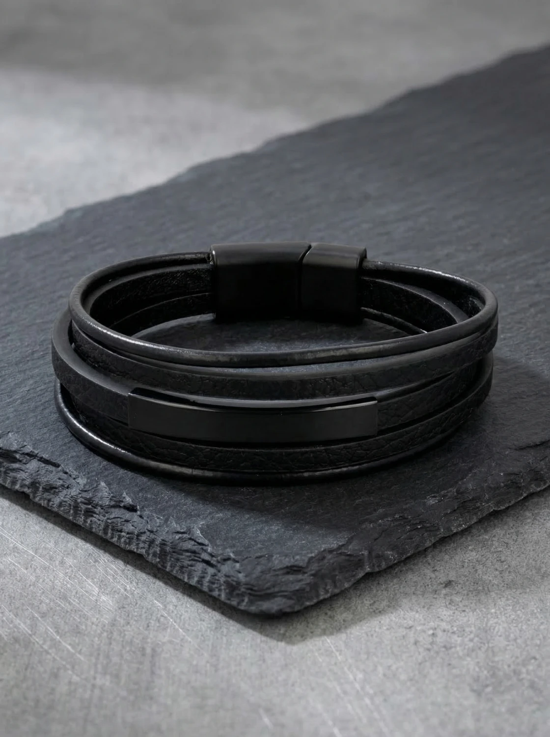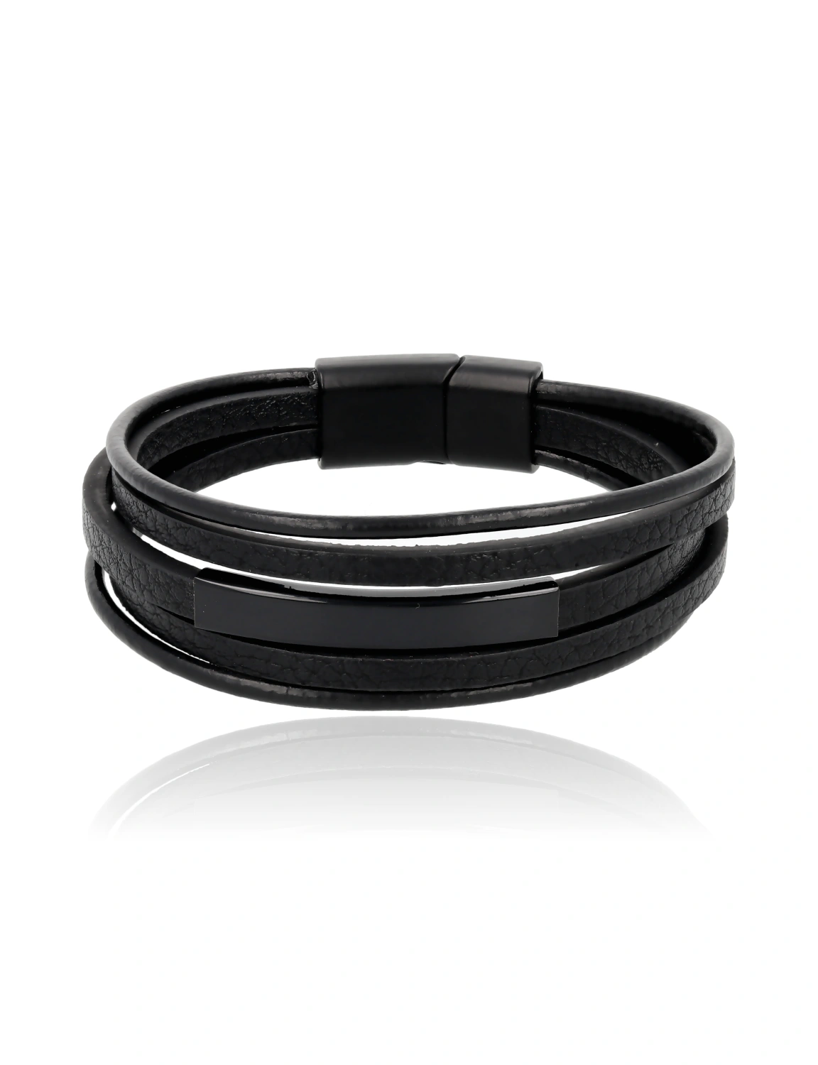 Bransoletka męska z rzemieni w tym modelu została zastąpiona minimalistyczną formą wielowarstwowej skóry, co nadaje jej nowoczesny i elegancki charakter. Gładkie, czarne paski w połączeniu z subtelną stalową wstawką tworzą stylowy dodatek dla mężczyzn ceniących prostotę i design. Solidne zapięcie magnetyczne zapewnia wygodę noszenia na co dzień. To uniwersalna bransoletka, która doskonale uzupełni zarówno casualowe, jak i bardziej formalne stylizacje.