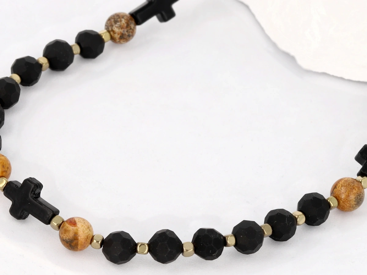 Naszyjnik męski z koralików naturalnych topaz lawa wulkaniczna ze złotą przekładką.