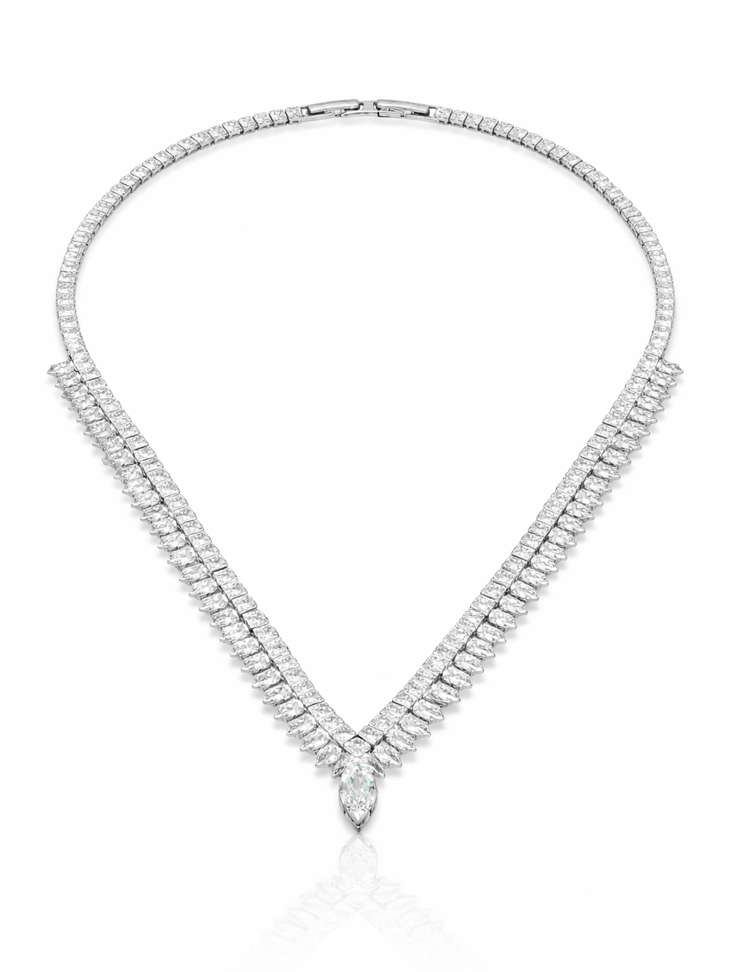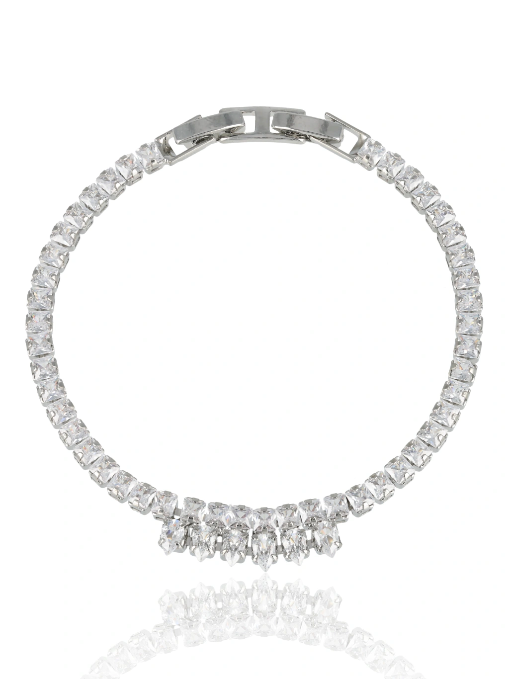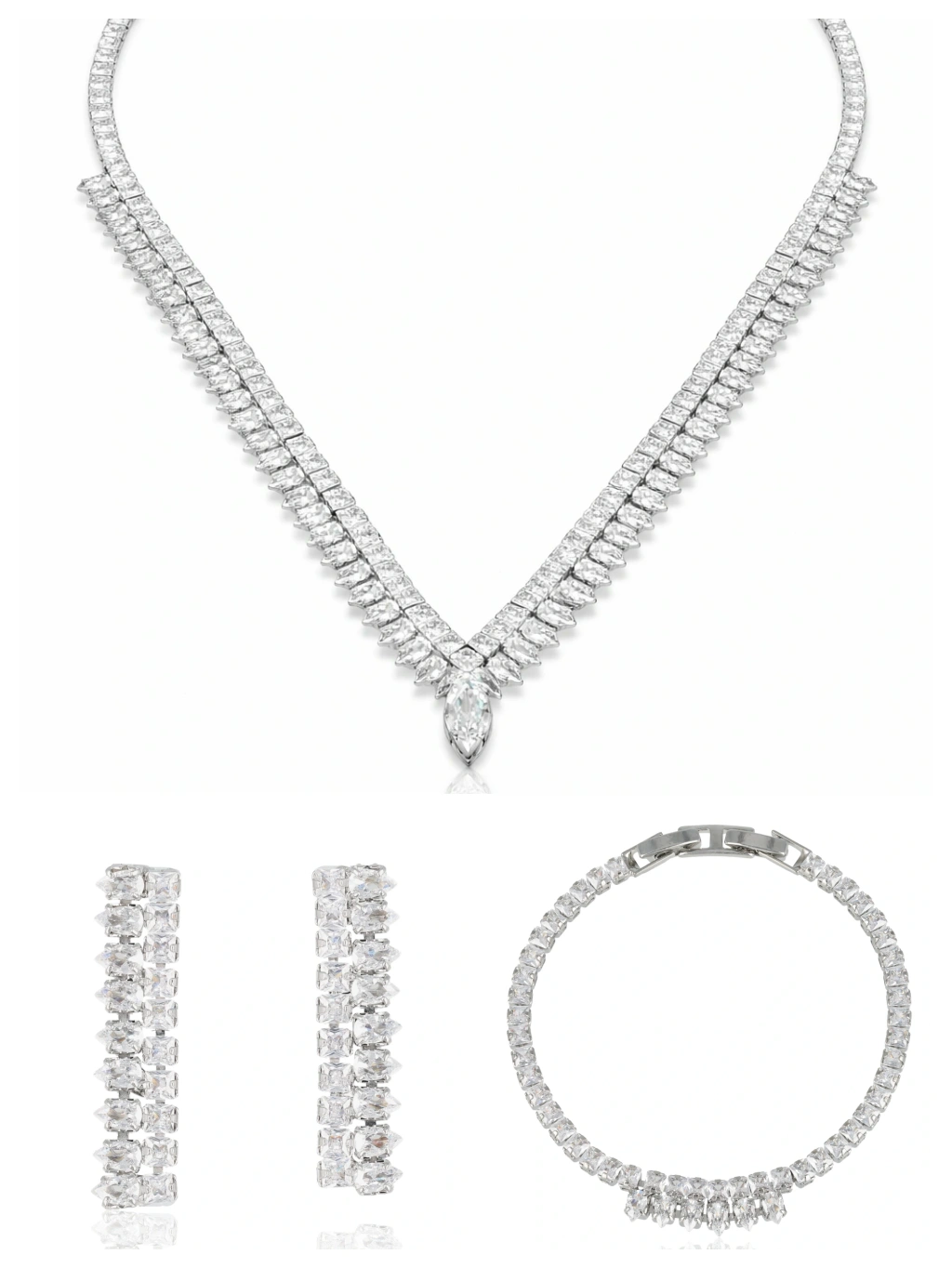Zjawiskowy komplet biżuterii w stylu glamour, który przyciąga spojrzenia elegancją i blaskiem. Naszyjnik o efektownej, podwójnej linii zdobień z cyrkonii zakończony ozdobnym akcentem w kształcie kropli, tworzy harmonijną całość z dopasowaną bransoletką i kolczykami. Idealny wybór na wieczorowe okazje, przyjęcia i wyjątkowe wydarzenia, gdzie liczy się olśniewający wygląd i perfekcyjne wykończenie detali.