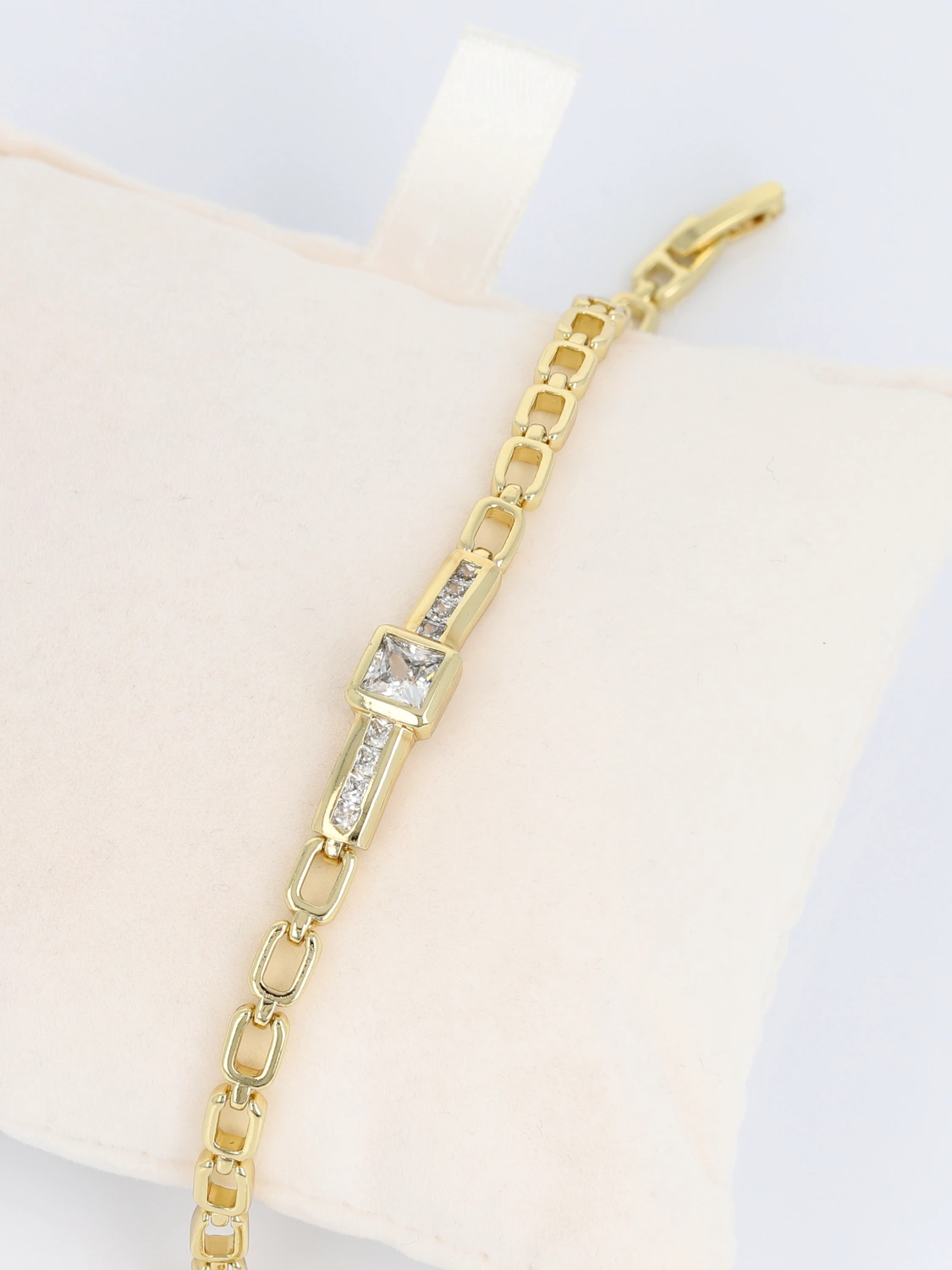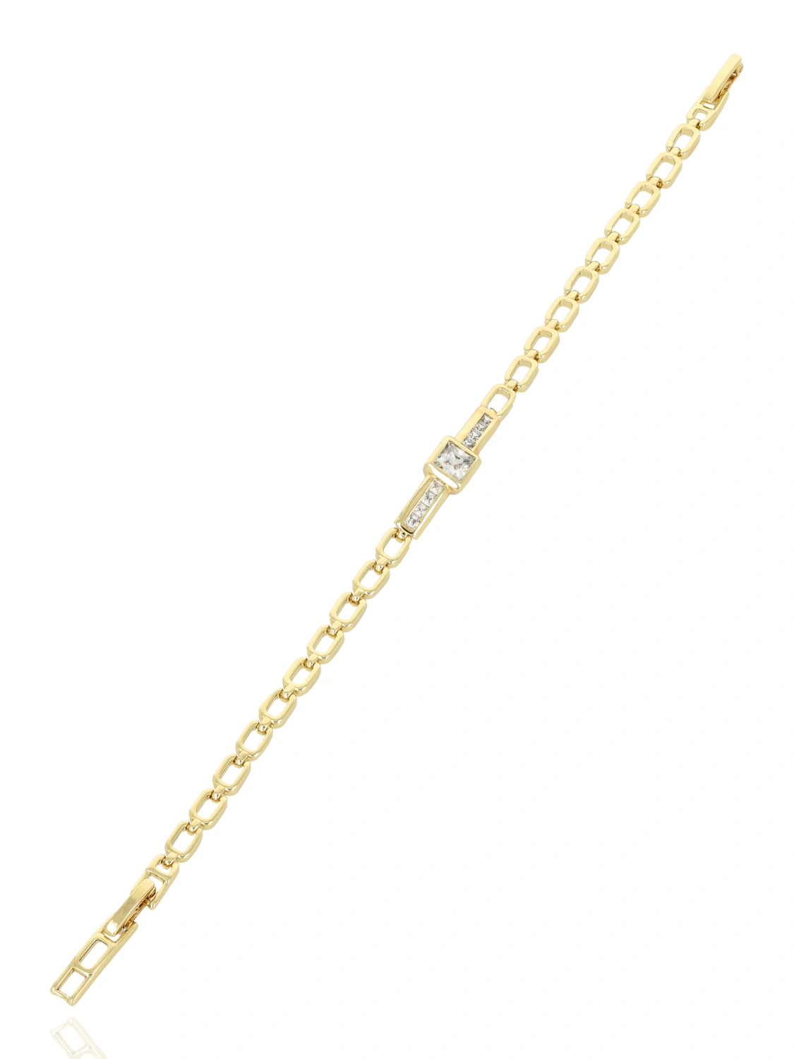 Nowoczesna bransoleta pozłacana Xuping w odcieniu włoskiego złota, z wyraźnym centralnym elementem ozdobionym cyrkoniami. Prosta forma łańcuszka połączona z geometrycznym detalem tworzy elegancką i przyciągającą uwagę bransoletkę damską.