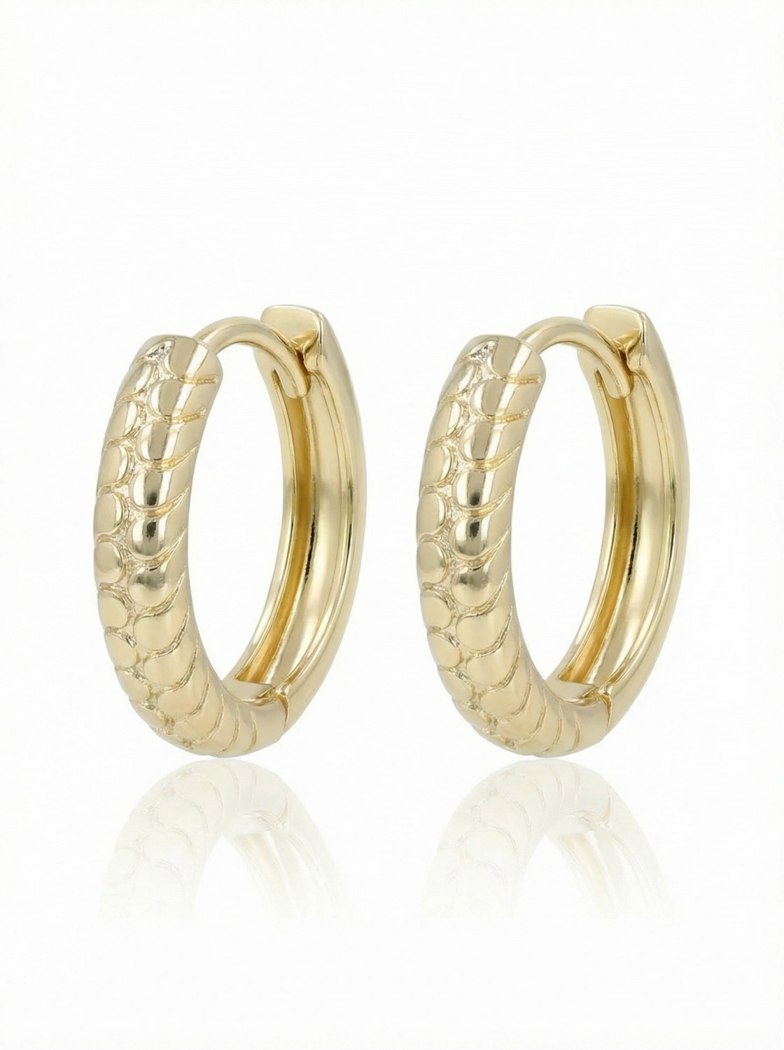 Wyraziste kolczyki o lekko nieregularnej strukturze przyciągają uwagę subtelną fakturą i ciepłym połyskiem. Kolczyki z włoskiego złota łączą klasyczną formę z nowoczesnym wykończeniem, dzięki czemu prezentują się stylowo i ponadczasowo. Te kolczyki damskie doskonale sprawdzą się jako kolczyki na co dzień, dodając charakteru zarówno prostym, jak i bardziej eleganckim stylizacjom.