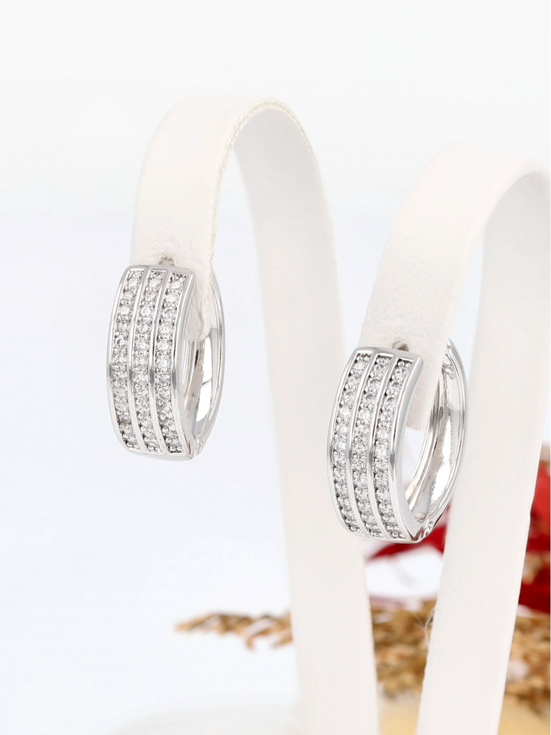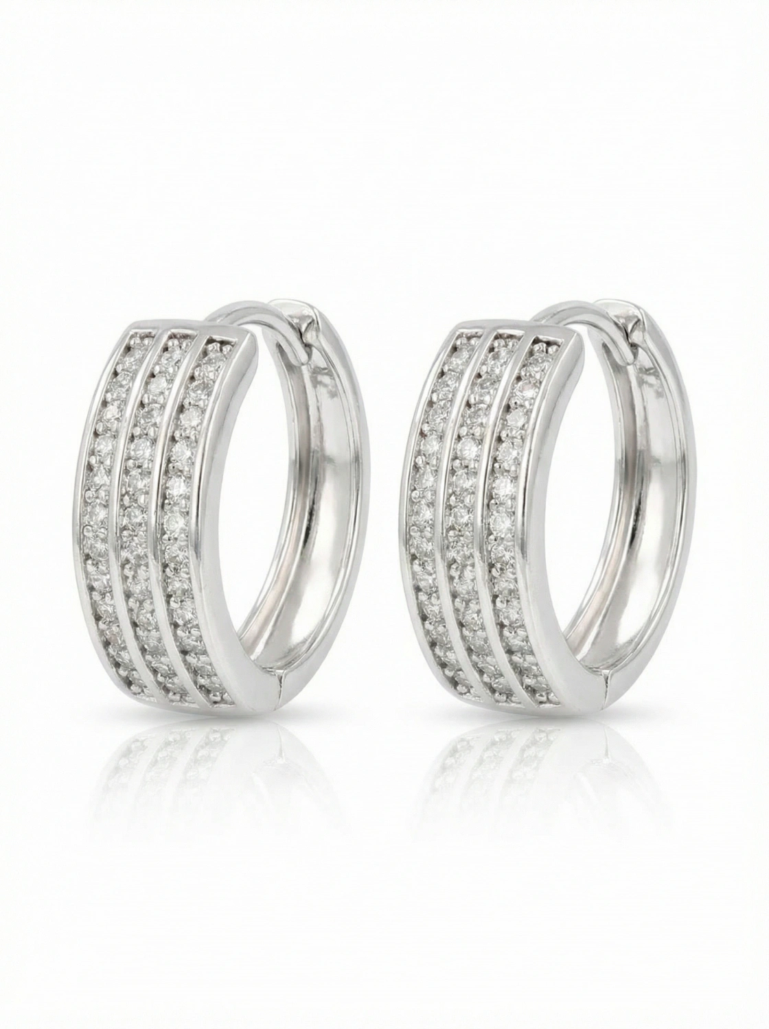 Eleganckie kolczyki rodowane zdobione trzema równoległymi pasmami drobnych, lśniących cyrkonii tworzą efekt głębi i wyjątkowego blasku. Starannie wyprofilowana forma sprawia, że kolczyki pięknie układają się na uchu, podkreślając kobiecy styl. Kolczyki w kolorze srebra w chłodnym, srebrzystym wykończeniu łączą klasykę z nowoczesnym akcentem. To kolczyki koła idealne dla osób, które szukają dodatku przyciągającego uwagę, a jednocześnie uniwersalnego – świetne zarówno do codziennych stylizacji, jak i na wieczorne wyjścia.
