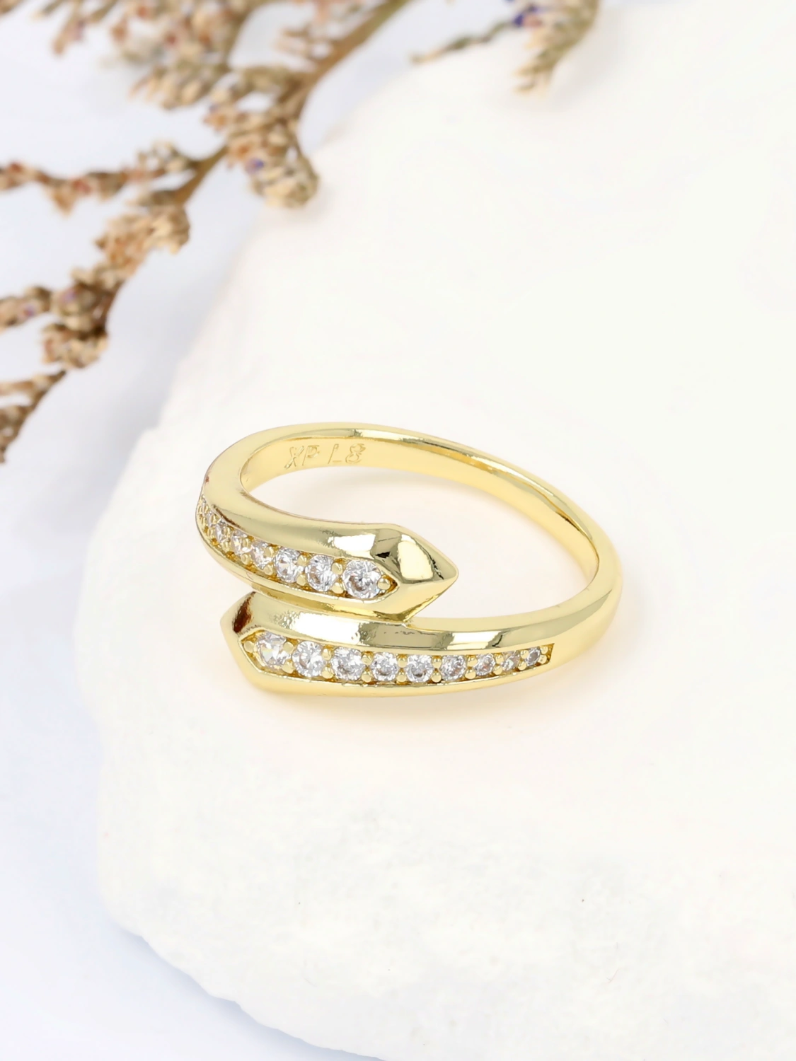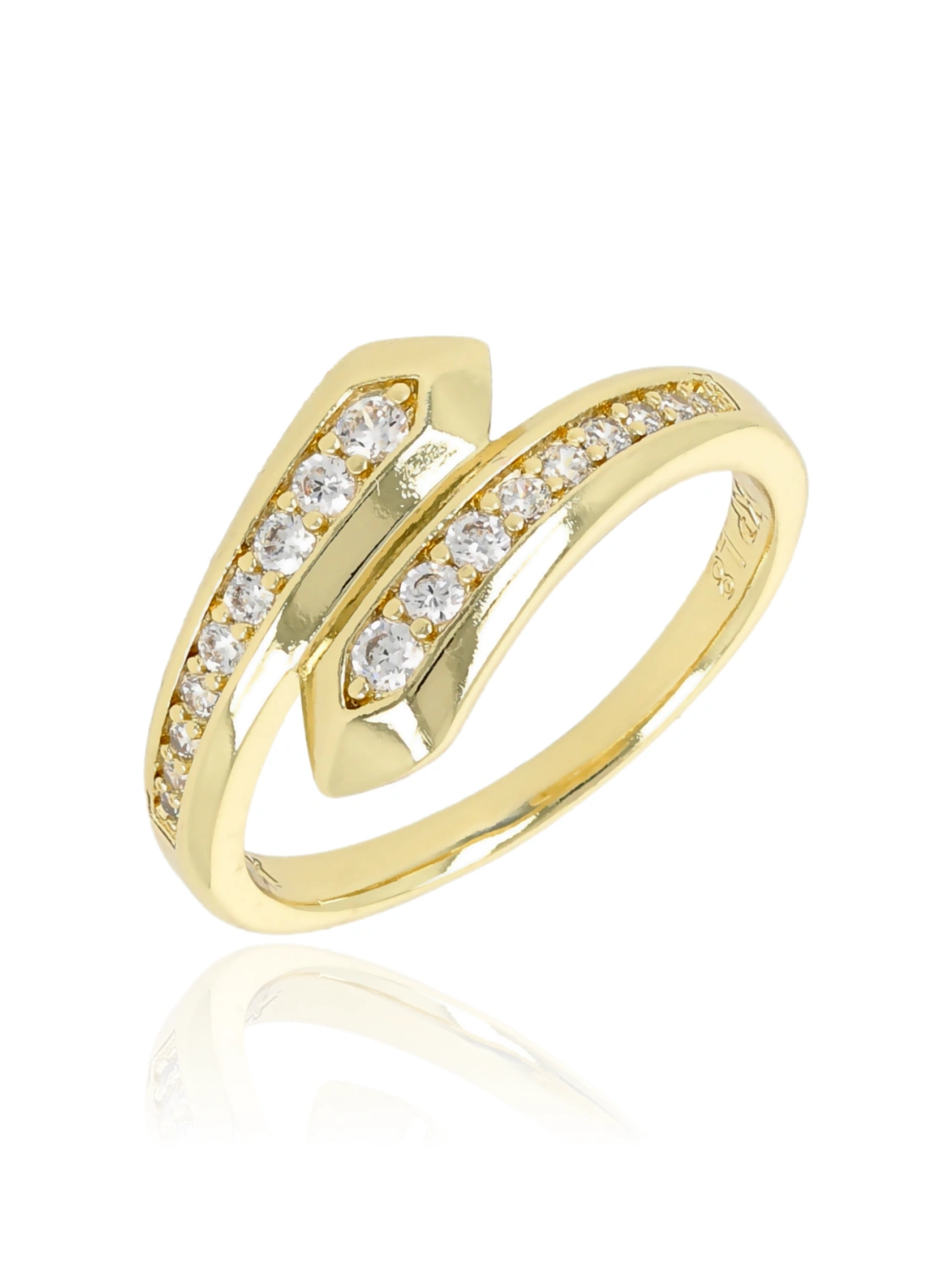 Nowoczesny pierścionek pozłacany Xuping w kolorze włoskiego złota, którego forma opiera się na przenikających się liniach ozdobionych subtelnymi cyrkoniami. Ten model wyróżnia się na tle klasycznych pierścionki damskie, dodając stylizacji dynamicznego charakteru i elegancji. W kategorii pierścionki pozłacane przyciąga uwagę geometryczną formą i wyważonym blaskiem. Idealny dla osób, które wybierają pierścionki łączące minimalizm z wyrazistym designem.