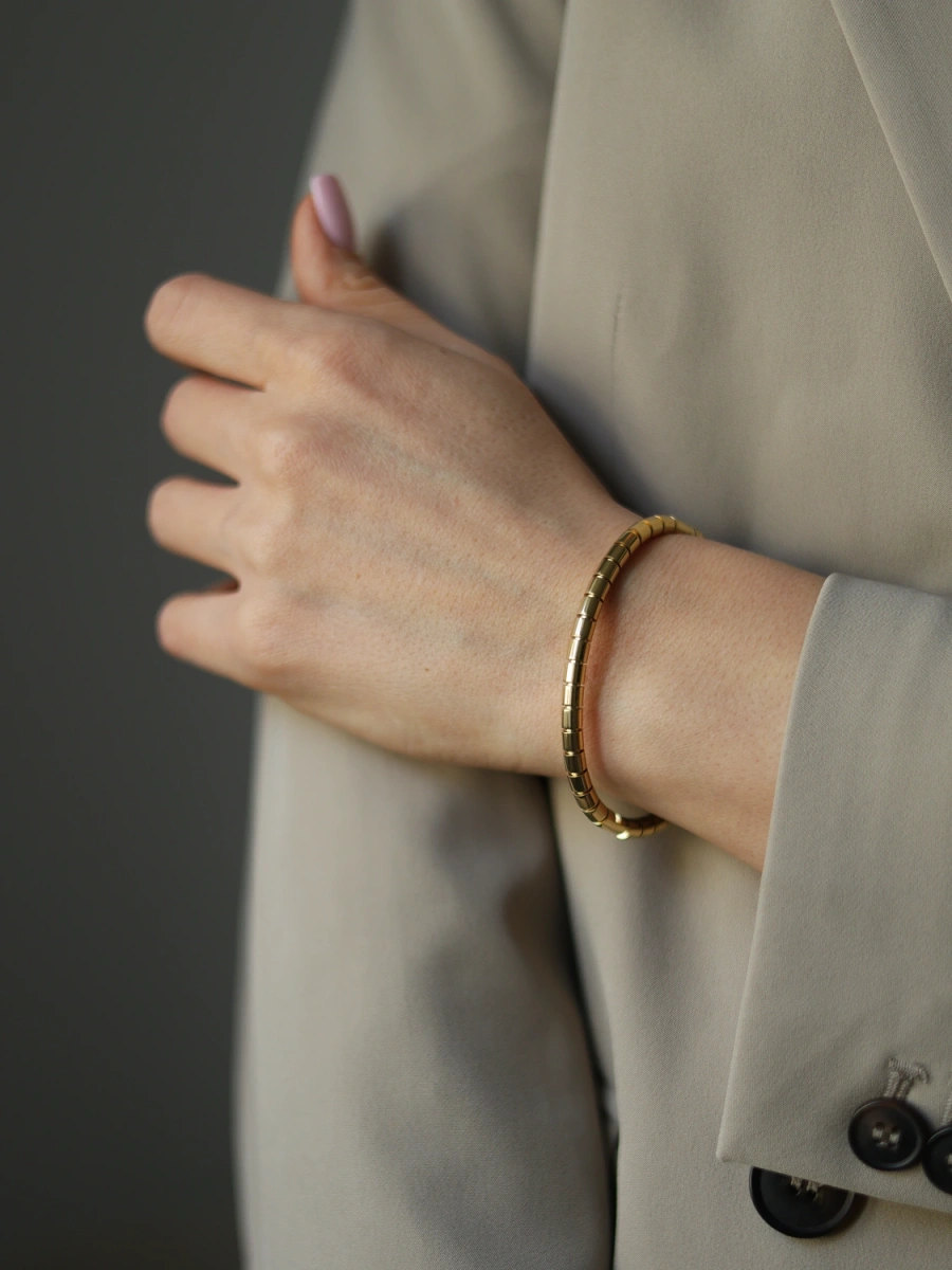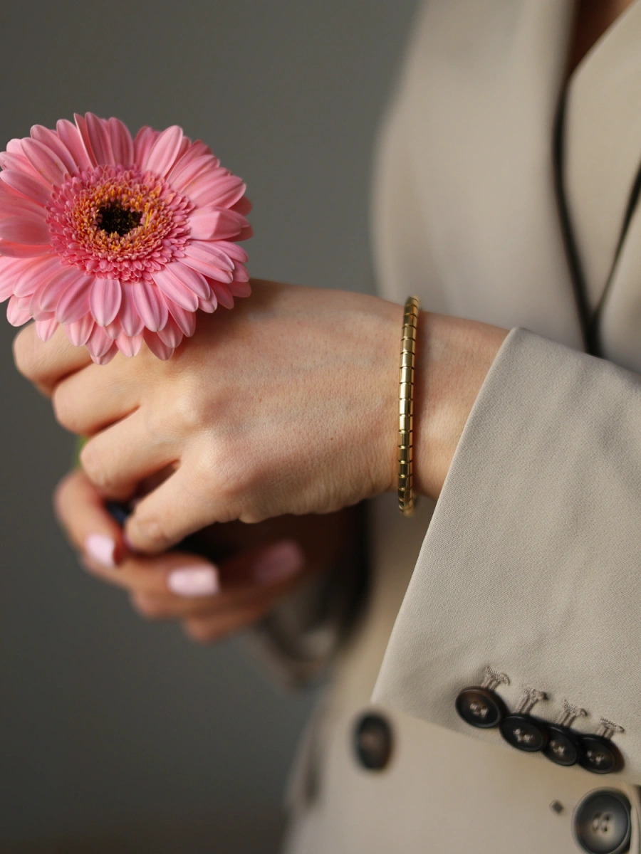 Bransoleta minimalistyczna nowoczesna, podkreśla elegancki ubiór, pasuje do codziennych stylizacji.