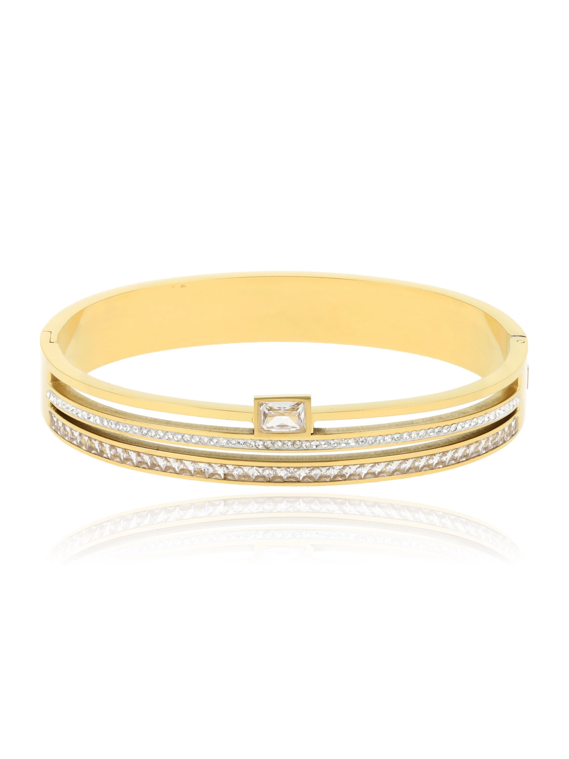 Elegancka bransoletka w odcieniu złota to propozycja dla kobiet ceniących nowoczesną klasykę z nutą glamour. Sztywna forma została ozdobiona subtelnymi liniami lśniących cyrkonii oraz centralnie umieszczonym, geometrycznym kamieniem, który nadaje całości wyrafinowanego charakteru. Minimalistyczny, a zarazem efektowny design sprawia, że model doskonale podkreśli zarówno codzienne stylizacje, jak i wieczorowe zestawy.