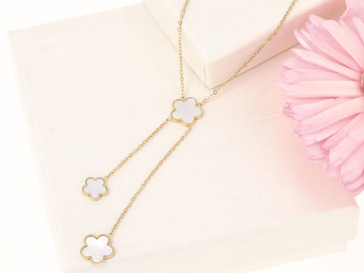 Naszyjnik krawatka kwiatek ze stali szlachetnej masa perłowa.